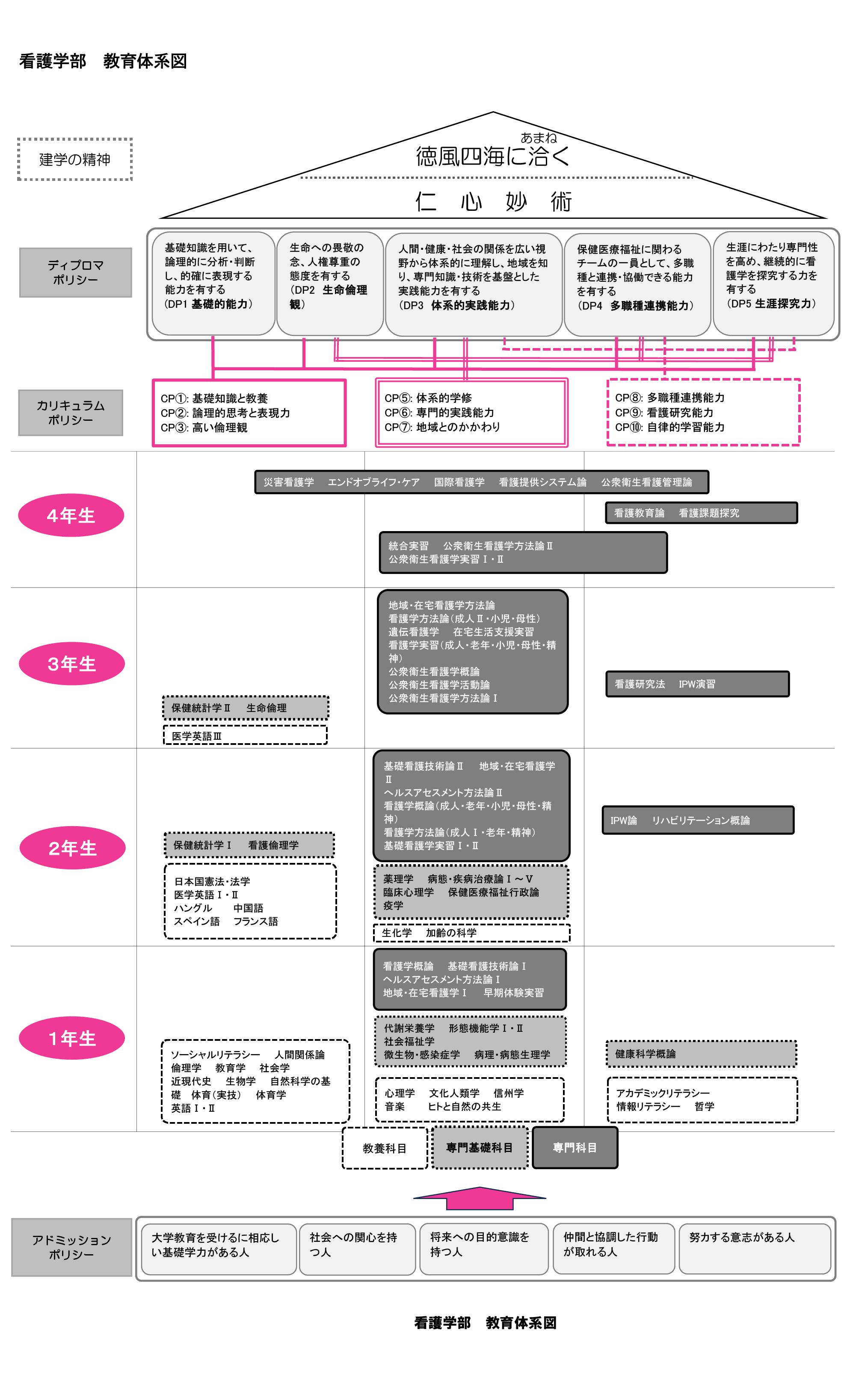 本学のディプロマポリシーは、「看護学部」のページに掲載しておりますので、