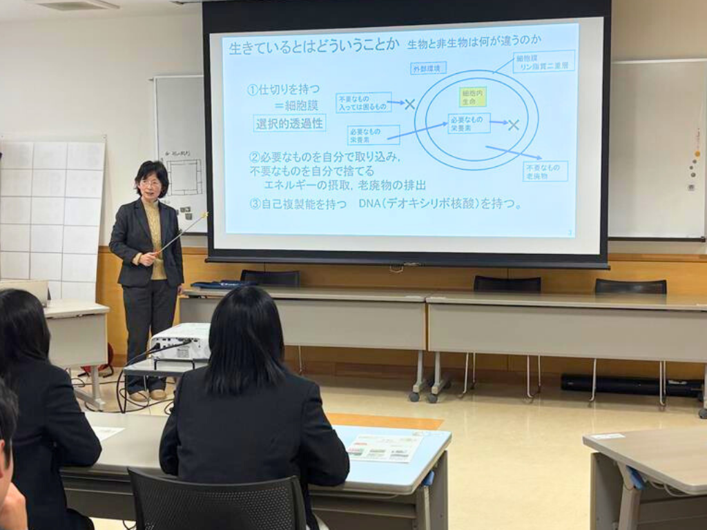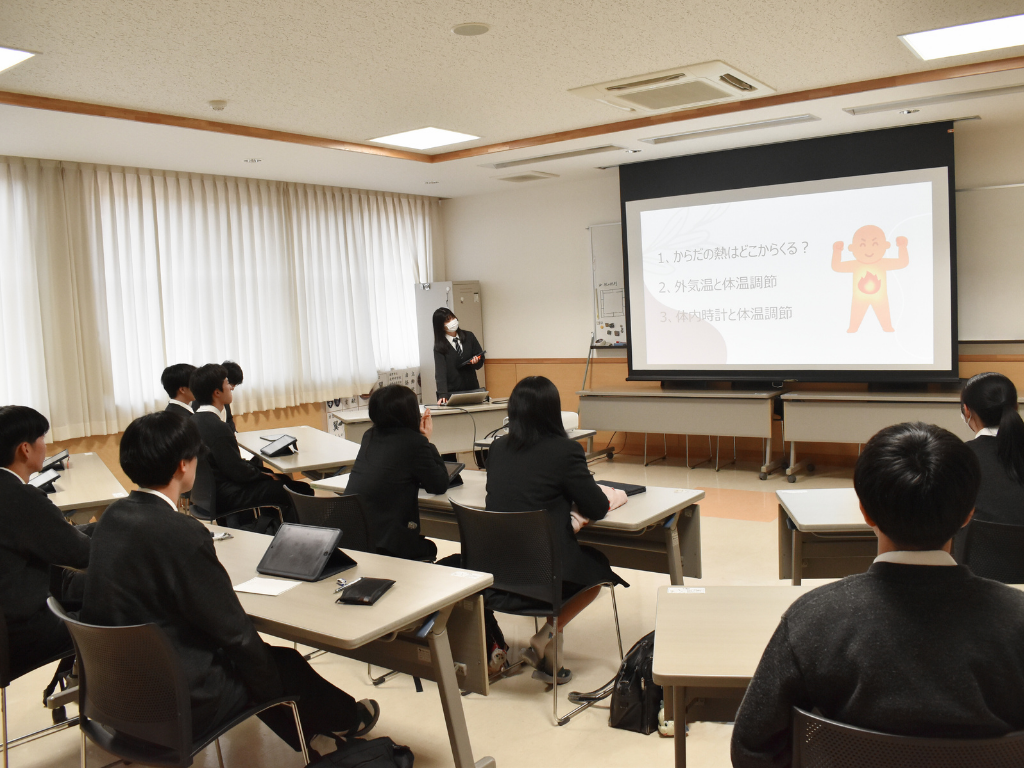 第2クールは本学共通教養センター 三井由香准教授が担当。1回目は、12月16日(火)に行われ、三井先生から生理学分野の講義を聴き、生きている理由(ことわり)や生きているとはどういうことか、どうして生物は生きていられるのか、ということについて理解を深めました。最後に三井先生から、自分が興味を持った体内のメカニズムや現象等について調べるよう課題が出されました。  2回目は、12月23日(火)に行われ、前回出された課題について、生徒の皆さんが興味を持った分野について発表を行いました。生徒の皆さんは、自身の経験を踏まえ自律神経失調症や冷え性、内臓の機能などについて、文献やインターネットなどを参考にして準備して発表に臨んでいました。