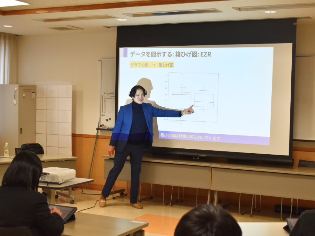第1クールは本学保健科学部リハビリテーション学科理学療法学専攻 倉澤康之助教が担当。1回目は令和7年12月3日(水)に行われ、「研究結果を信じ切っていいの?医療統計を知って真実がわかる医療者になろう!」をテーマに講義を行いました。科学的根拠に基づいた治療や研究ができる医療職になることで、より良いケアを提供できる、また、医療の発展につながると話がありました。生徒の皆さんは、研究の目的によって研究の方法を選ぶことを教わり、次にExcelを使ってデータの入力方法を学びました。データの入力規則があること、テーブル機能を使うと効率的にデータの特徴をつかむことができることを学びました。  2回目は、12月11日(木)に行われ、倉澤先生からアンケートの例題が出され、生徒各自がエクセルを用いて集計する方法を学びました。生徒の皆さんにとっては難しい内容だったようですが、医療統計の実際に触れ、そこから何を読み取るかを実践できたと思います。