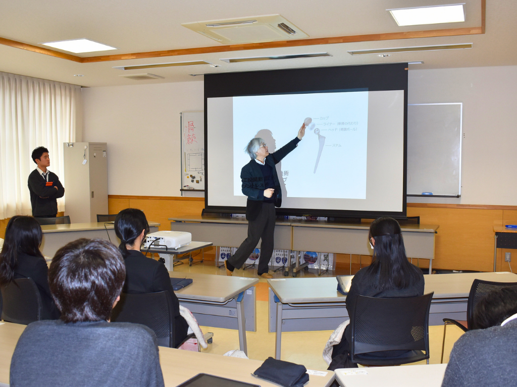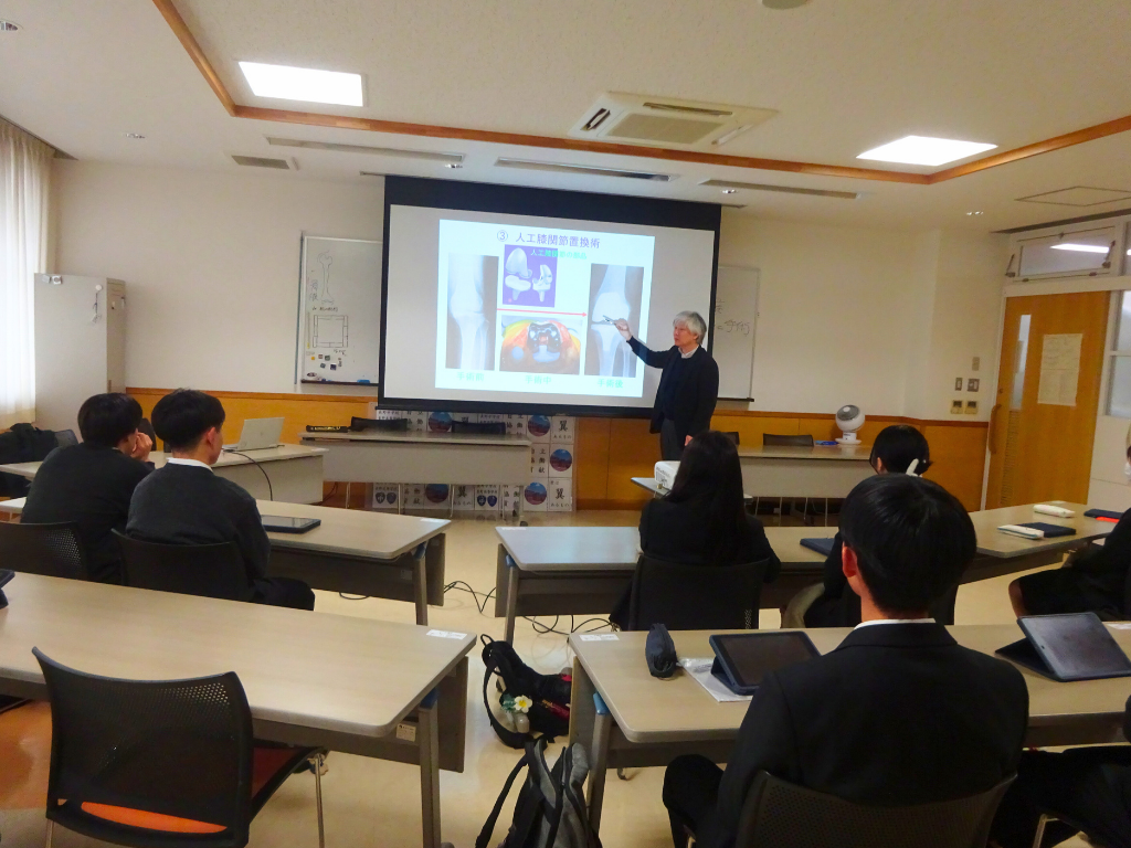 第3クールは、本学地域保健医療研究センター 齋藤直人教授が担当。1回目は、令和8年1月15日(木)に行われ、「膝関節と股関節」をテーマに講義が行われました。整形外科と形成外科の違いから始まり、主訴で一番多いのが腰痛であることなどに触れながら、実は整形外科は手術が少なく、保存的治療(内科的治療)が主で「整形内科」であるという話がありました。また、膝関節の構造と機能についての説明があり、代表的な疾患である変形性膝関節症の原因、症状、治療法について図や写真とともに詳細な解説がありました。講義の最後に、第2日目は股関節をテーマとし、股関節の構造から疾病、治療法までを分担して探究し、その成果を発表するよう、指示が出されました。 2回目は、1月29日(木)に行われ、前回の講義を踏まえ股関節の構造から疾病、治療について一人ひとりが分担し発表を行いました。生徒は各自イラストなどを用い、骨の名前を含め股関節の構造や股関節に関わる疾病などについて自分の言葉で他の生徒が理解できるようわかりやすく解説を行いました。